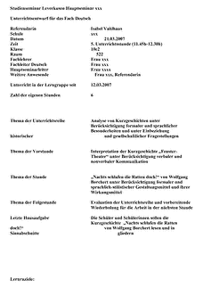 Dies ist ein Unterrichtsentwurf zu der Kurzgeschichte " Nachts schlafen die Ratten doch" von Wolfgang Borchert.