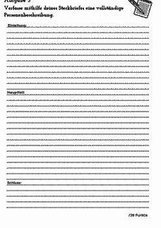 eine Aufgabe, die sich auf fünf wichtige Merkmale beim Verfassen der Personenbeschreibung bezieht eine Aufgabe, die Aussagen beinhaltet, über die SuS entscheiden müssen eine Aufgabe, wo SuS den Steckbrief für ihre Personenbeschreibung anfertigen