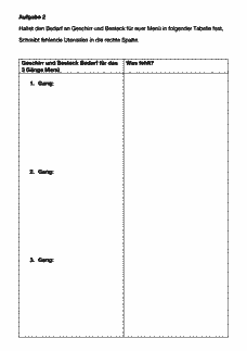 Arbeitsblatt zum Tisch decken + Sammlung für Menü Geschirr, dient der Planung